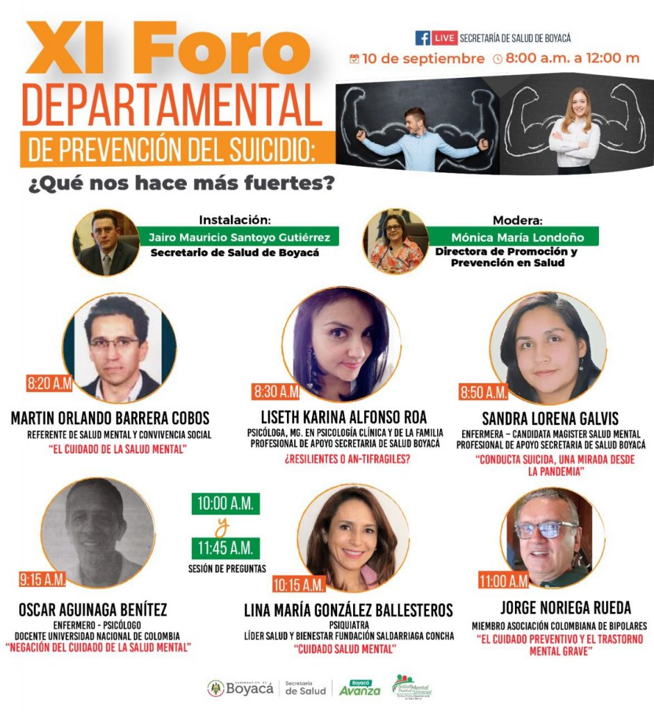¿Qué nos hace más fuertes? es la pregunta que surge en el XI Foro Departamental de Prevención del Suicidio, que se realizará de manera virtual, a través del Facebook Live de la Secretaría de Salud de Boyacá, este viernes 10 de septiembre, a partir de las 8:00 de la mañana.