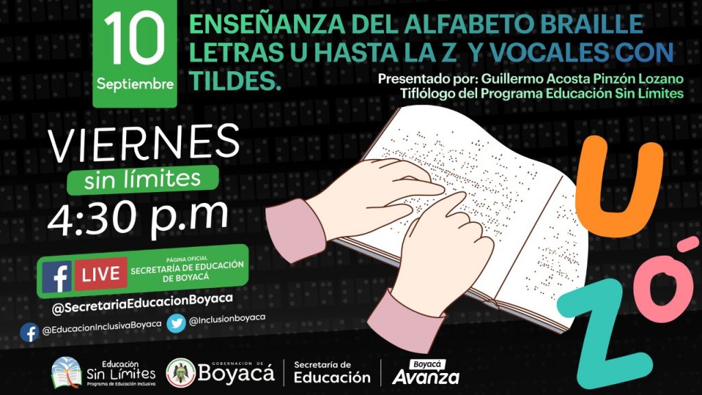 "La enseñanza del alfabeto braille de la letra U hasta la Z y vocales con tildes" se denomina el taller que realizará la Secretaría de Educación de Boyacá y que coordina el Programa Educación Sin Límite, en su espacio de todos los viernes, a partir de las 4:30 de la tarde, por las redes sociales de la Secretaría de Educación de Boyacá y Youtube de la Gobernación de Boyacá, con el invitado especial, el tiflólogo, Guillermo Acosta Pinzón.