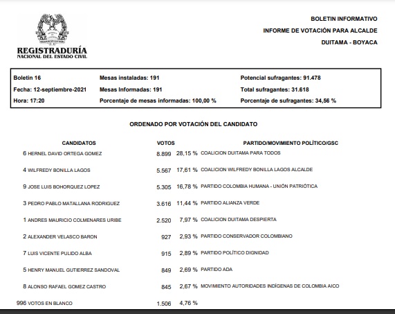 Boletín No. 16 Registraduría Nacional del Estado Civil. 100% de Mesas informadas