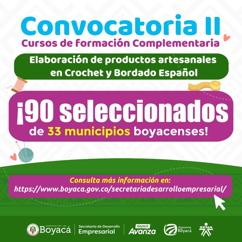 La Convocatoria de Cursos Complementarios para Artesanos liderada por la Secretaría Desarrollo Empresarial, el Programa Artesanías Boyacá; el SENA Centro de Gestión Administrativa y Fortalecimiento Empresarial CEGAFE, y la Mesa Sectorial de Artesanías, seleccionaron un total de 90 artesanos para los dos cursos ofrecidos.