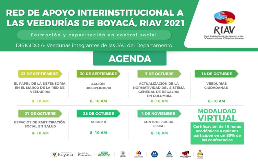La Secretaría Técnica de la Red Interinstitucional de Apoyo a las Veedurías Ciudadanas de Boyacá, (RIAV), asumida por la Dirección de Inversión Pública de la Secretaría de Planeación Departamental, lidera el proceso.