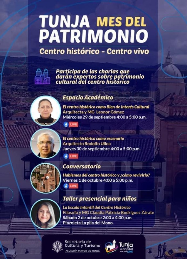 En el marco del Mes del Patrimonio la Secretaría de Cultura y Turismo, tiene planeado un evento que permitirá visibilizar la importancia del Centro Histórico de Tunja como bien de interés cultural, por ese motivo da a conocer la agenda que irá del 29 de septiembre al 2 de octubre.