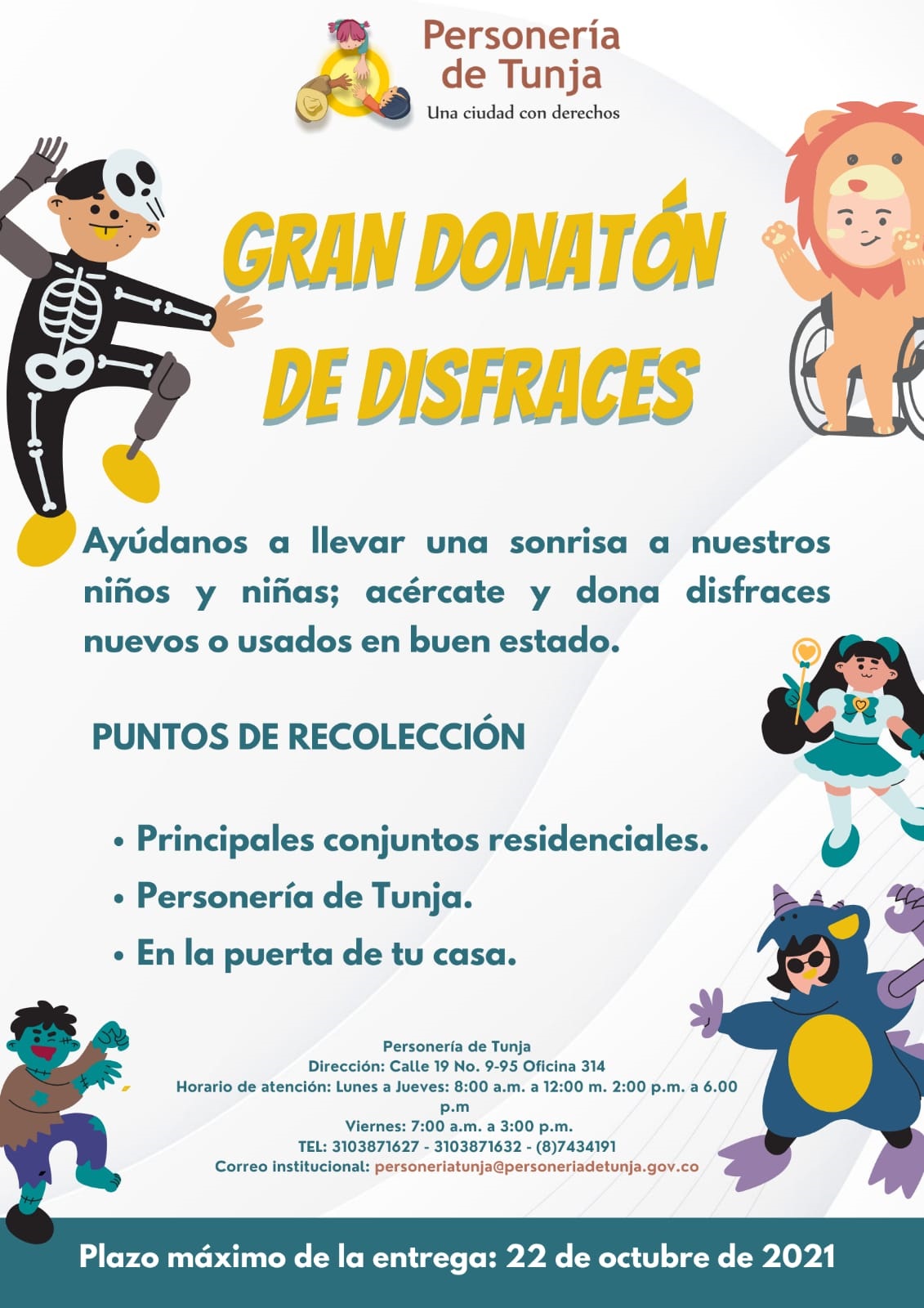 La donación de los disfraces se realizará en toda la ciudad y en las oficinas de la Personería ubicadas en calle 19 N° 9-95 oficina 314, también se podrán comunicar al 3103871627.