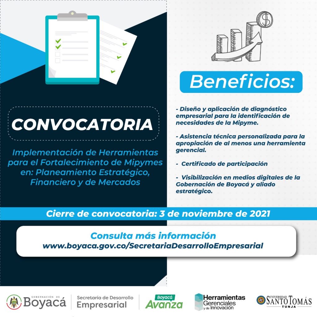 La Gobernación de Boyacá, a través de la Secretaría de Desarrollo Empresarial, liderada por Jessica Albarracín Montaña, y el programa Herramientas Gerenciales y de Innovación de la Dirección de Desarrollo Empresarial, coordinada por Felipe Puentes Vela, en convenio con la Universidad Santo Tomás de Tunja, lanzan la convocatoria denominada 'Implementación de herramientas para el fortalecimiento de Mipymes en planeamiento estratégico, financiero y de mercados'.