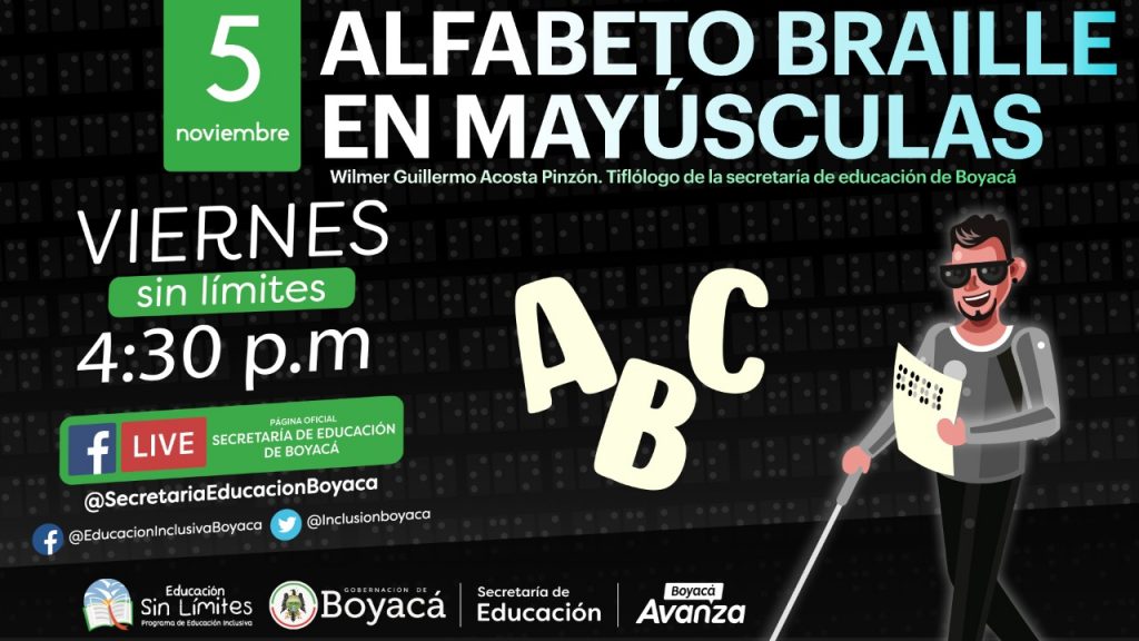 El integrante del equipo de Inclusión de la Secretaría de Educación, Wilmer Guillermo Acosta Pinzón, continuará el proceso de enseñanza del alfabeto Braille en Mayúsculas, en la sesión de este 5 de octubre, de Viernes sin Límite, a partir de las 4:30 p.m. por las redes sociales de la Secretaría de Educación y Youtube de la Gobernación de Boyacá.