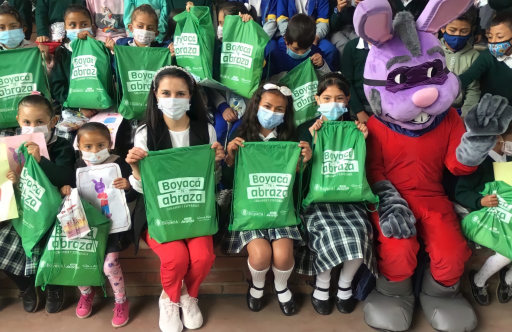 En la misma jornada, la gestora Social del departamento, hizo entrega de bolsos que contienen camisas, pantalonetas y tenis a los estudiantes de la institución educativa como parte del programa ´Boyacá Te Abraza´.