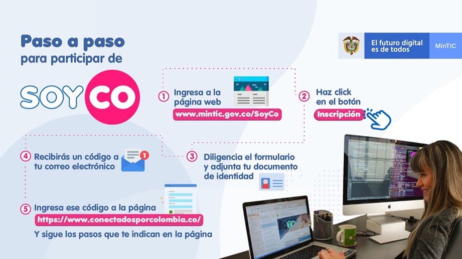 Para inscribirse, ingrese al sitio web mintic.gov.co/soyco, haga click en el botón inscripción, diligencie el formulario y adjunte copia del documento de identidad. Luego, recibirá en su correo electrónico un código que debe registrar en el sitio www.conectadosporcolombia.co y seguir los pasos que se indican. Los interesados podrán acceder a solo un dominio para redimir.