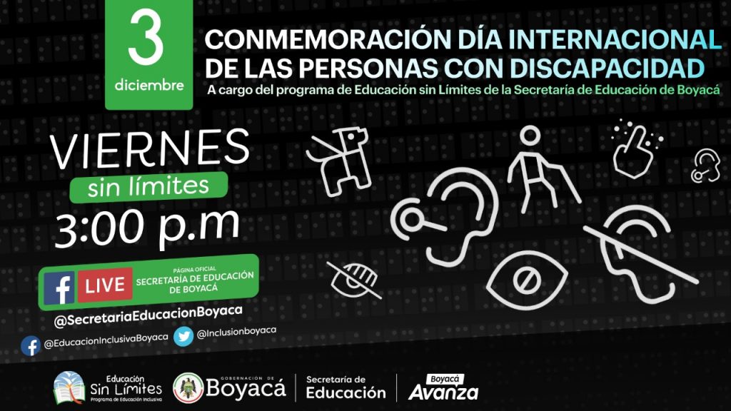 El Programa de “Educación sin Límites” de la Secretaría de Educación de Boyacá invita a la comunidad educativa a participar en la Conmemoración del Día Internacional de las Personas con Discapacidad, este 3 de diciembre, a partir de las 3:00 p.m., en su espacio virtual en Facebook Live y Youtube de la sectorial y la Gobernación de Boyacá.