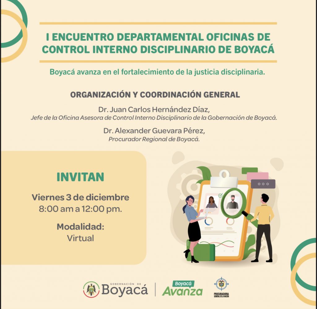 Con la organización y coordinación del jefe de la Oficina Asesora de Control Interno Disciplinario de la Gobernación de Boyacá, Juan Carlos Hernández Díaz, y el procurador Regional de Boyacá, Alexander Guevara Pérez, se realizará este viernes 3 de diciembre, a partir de las 8:00 a.m., el Primer Encuentro Departamental de Oficinas de Control Interno Disciplinario por las redes sociales de la Gobernación y la Secretaría de Educación de Boyacá.
