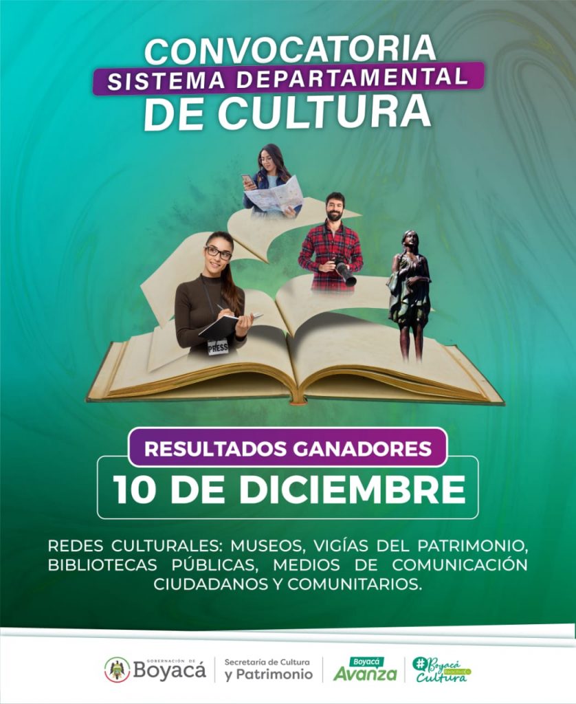 El 10 de diciembre a través de la página web www.boyacá.gov.co y las redes sociales institucionales de la secretaría de Cultura y Patrimonio se conocerán los ganadores de la presente convocatoria dirigida a Bibliotecas Públicas Municipales, Museos, Vigias del Patrimonio Cultural y Medios de Comunicación Ciudadanos y Comunitarios.