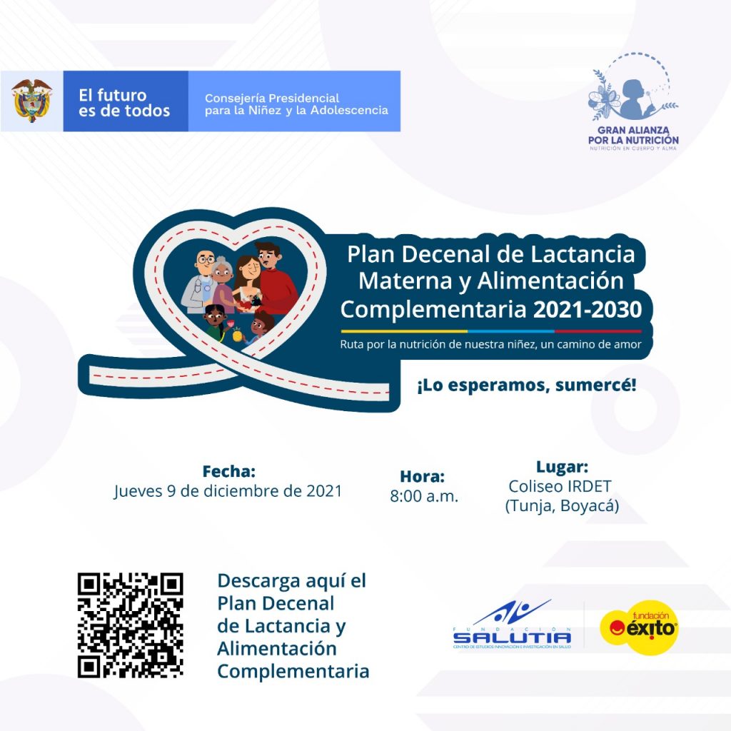 En el marco de la Gran Alianza por la Nutrición, iniciativa liderada por la Primera Dama de la Nación, María Juliana Ruiz, este 9 de diciembre se hará entrega al departamento de Boyacá y sus municipios, del Plan Decenal de Lactancia Materna y Alimentación Complementaria 2021-2030, ‘Ruta por la nutrición de nuestra niñez, un camino de amor’, que tiene como principal objetivo evitar las muertes de niñas y niños, por y asociadas a desnutrición en Colombia. Durante el evento se presentarán además las acciones y estrategias de acompañamiento al departamento, para la implementación de esta política pública, de tal manera que se garantice su adopción y ejecución.