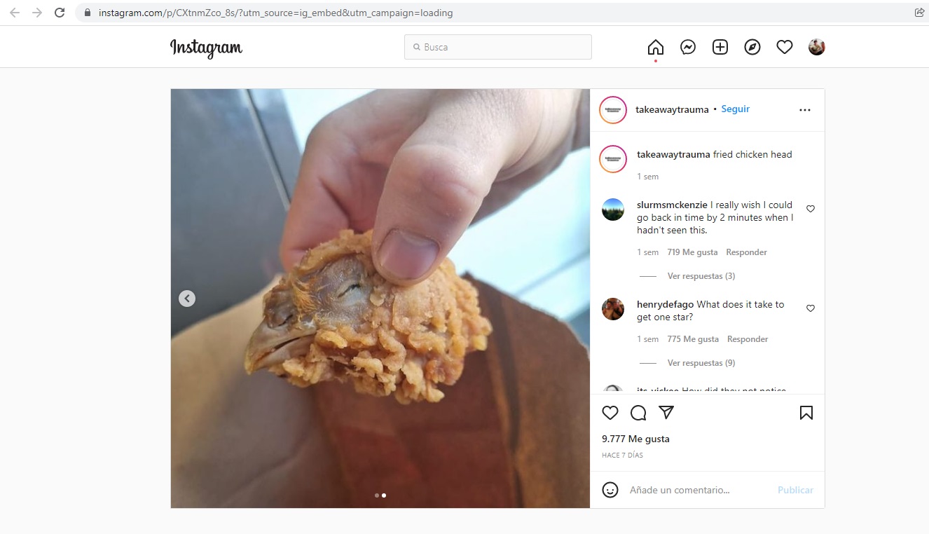 (Fotos)A través de la red social Instagram, una mujer en Reino Unido denuncia que en su pedido de alitas a la broaster le salió una cabeza de pollo apanada, la publicación ha generado varias reacciones de personas y también de animalistas