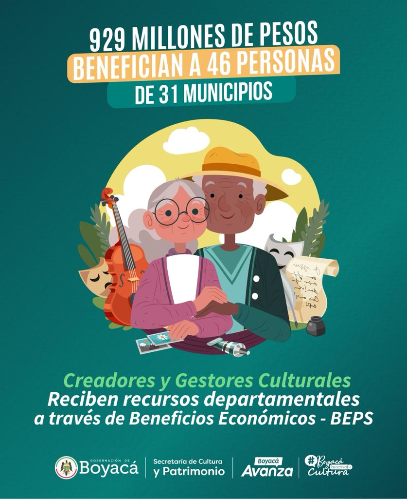 Estos recursos serán distribuidos entre 46 beneficiarios, de 31 municipios boyacenses, que cumplieron con el proceso referido en la normativa mencionada, acreditando así su calidad de gestores o creadores culturales, de acuerdo con los parámetros del Ministerio de Cultura.