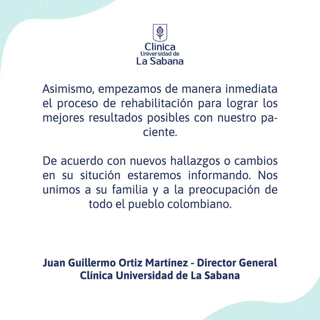 Juan Guillermo Ortiz Martínez, director de la Clínica de la Universidad de La Sabana, manifestó en su tercer comunicado sobre el estado de salud de Egan Bernal, que la intervención de neurocirugía culminó con éxito.