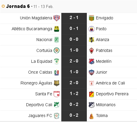 Culminó la sexta fecha del rentado nacional, Deportivo Cali le arrebata la última posición a Patriotas, Tolima es líder con 4 puntos de ventaja. Conozca los resultados y tabla de posiciones
