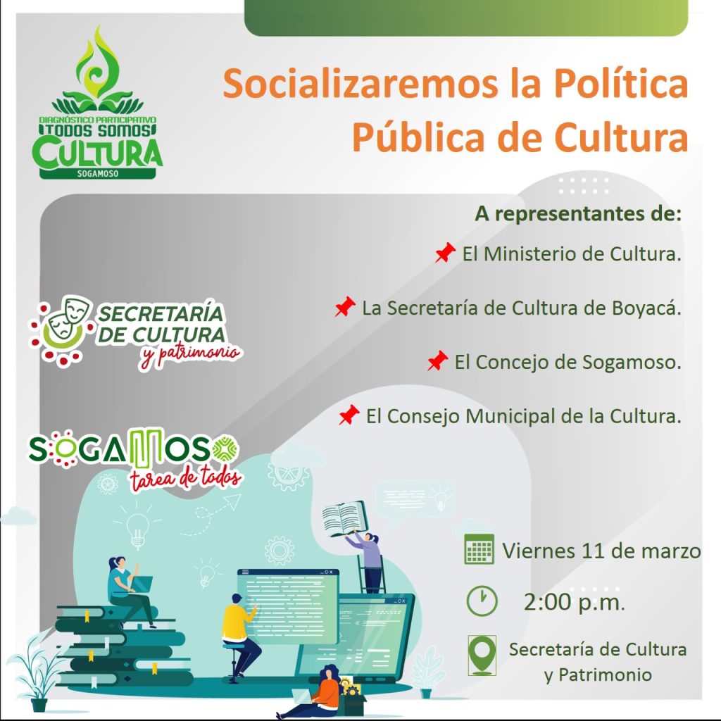 En la Secretaría de Cultura y Patrimonio de Sogamoso se llevará a cabo este viernes 11 de marzo, a partir de las 2:00 de la tarde, la mesa técnica de socialización de la Política Pública de Cultura de ese municipio.