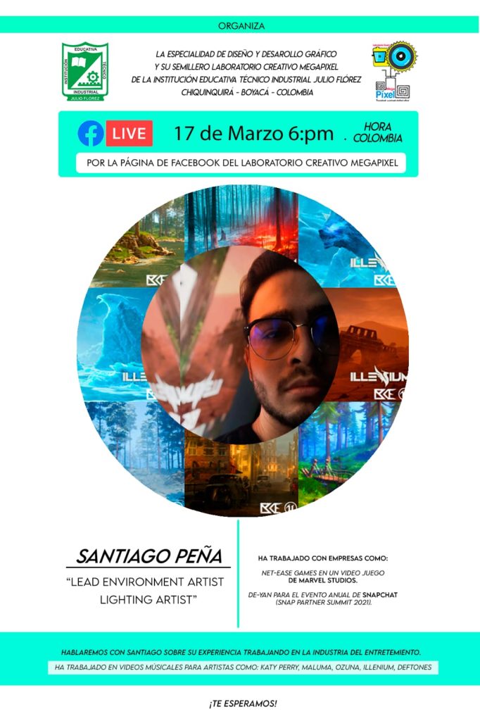 La Secretaría de Educación comparte la invitación a todos las personas interesadas en el diseño gráfico, las artes y comunicación visuales, la dirección de arte y el mundo audiovisual, para que participen este jueves 17 de marzo a las 6:00 p.m., en el primer Facebook live por la página del semillero laboratorio Creativo MegaPixel, con Santiago Peña, quien es LEAD ENVIRONMENT ARTIST / LIGHTING ARTIST, y tiene más de 5 años de experiencia trabajando con Unreal Engine.