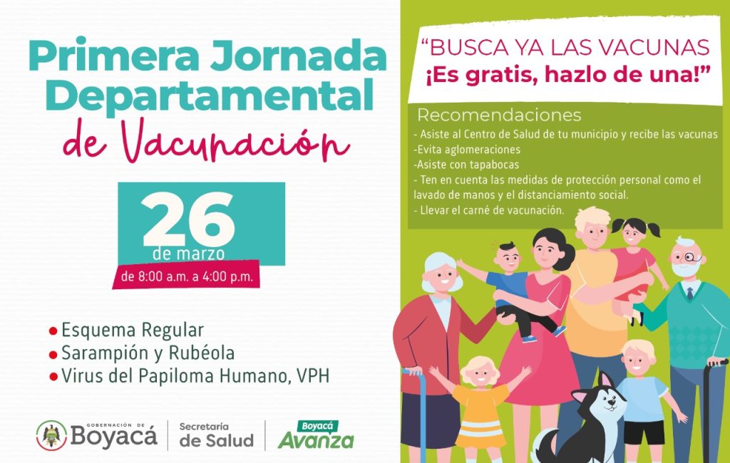 Con el propósito de dar cumplimiento a las metas nacionales en vacunación y fortalecer acciones para iniciar, continuar y completar esquemas de vacunación en el territorio departamental, la Secretaría de Salud de Boyacá invita a la comunidad a participar en la Primera Jornada Departamental de Vacunación, este sábado 26 de marzo, en jornada continua, de 8:00 a.m. a 4:00 p.m.