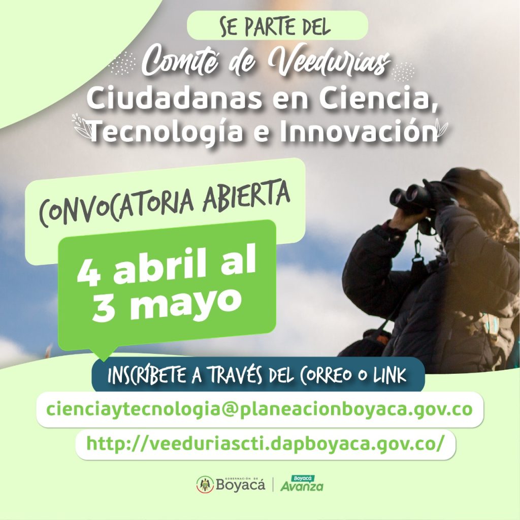 Con el fin de promover la participación ciudadana para ejercer la vigilancia sobre la gestión pública vinculada a las gestiones territoriales de los recursos de Ciencia, Tecnología e Innovación, la directora de Seguimiento y Planeación Territorial, Lina Parra, informa a los boyacenses que desde este 4 de abril pueden inscribirse en la convocatoria para integrar el Comité de Veedurías Ciudadanas en el link: https://bit.ly/3NQ8UNy.