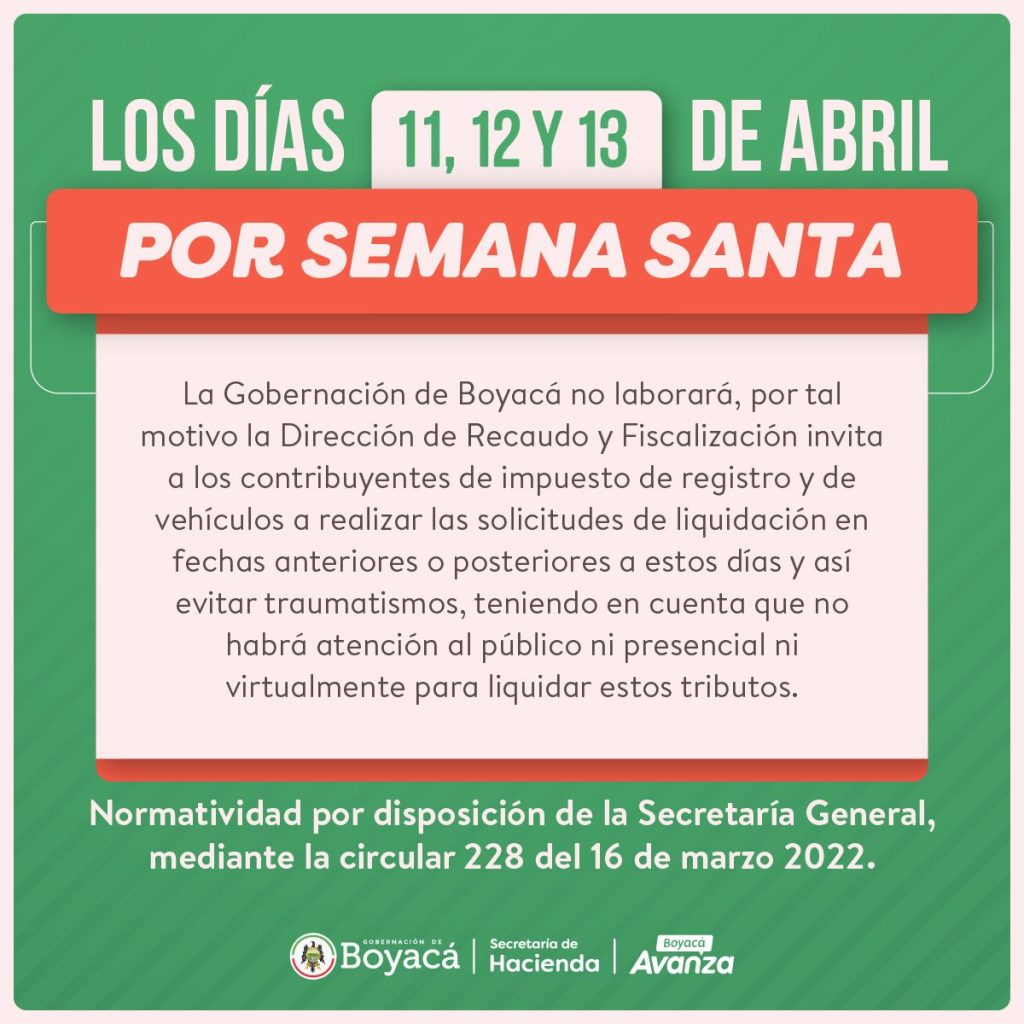 La Secretaría de Hacienda recuerda que, por disposición de la Secretaría General de la Gobernación de Boyacá, mediante circular 228 del 16 de marzo de 2022, los días 11, 12 y 13 de abril de Semana Santa no se laborará en la administración central.