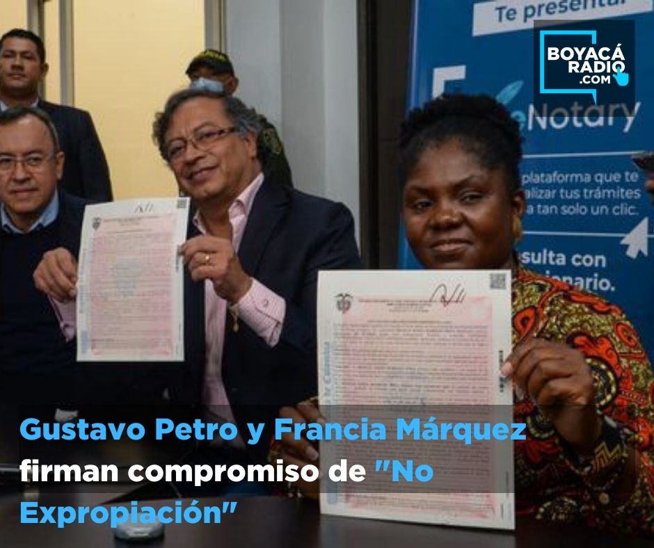 Este lunes el candidato presidencial del Pacto Histórico, Gustavo Petro, y su fórmula vicepresidencial, Francia Márquez, firmaron un documento en el que se comprometen a no expropiar "nada ni a nadie". El convenio fue suscrito y autenticado ante la Notaría 17 de Bogotá, ubicada en la Localidad de San Cristóbal.
