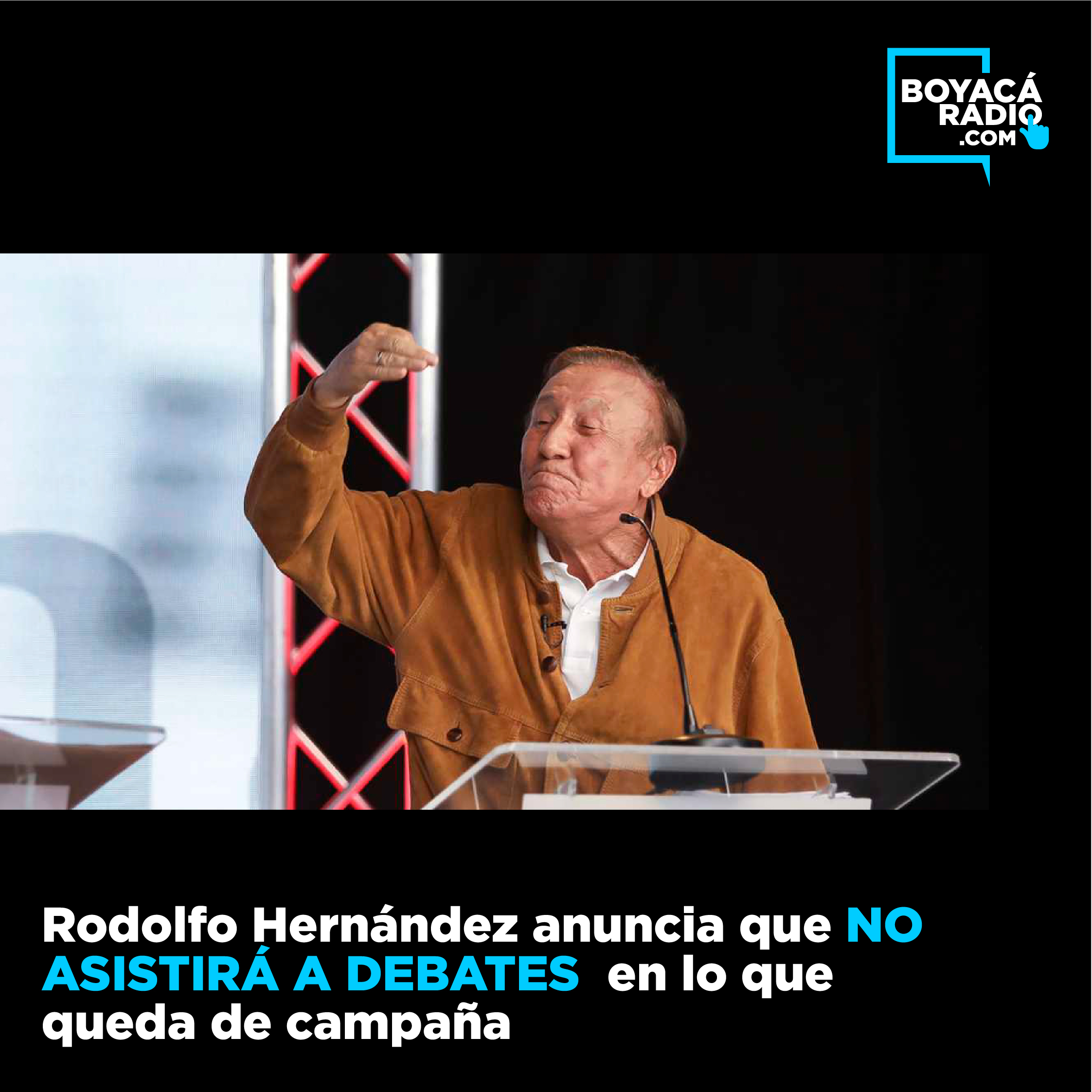 El candidato Rodolfo Hernández, ya había anunciado su no participación en los debates, porque irá “cara a cara”, individualmente, para exponer sus propuestas con amplitud y no en un corto tiempo, "en el que todo queda en el aire".