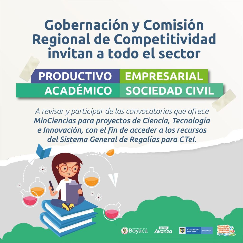 La Gobernación de Boyacá, a través de las secretarías de Planeación y Desarrollo Empresarial, en alianza con la Comisión Regional de Competitividad, invitan a todo el sector productivo, empresarial, académico y la sociedad civil a que participen en las convocatorias que ofrece Ministerio de Ciencias con el fin de acceder a los recursos del Sistema General de Regalías en Ciencia, Tecnología e Innovación (CTeI).