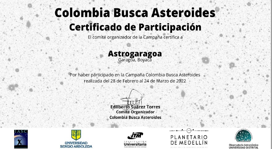 El inquieto docente de la Institución Educativa Técnica de Garagoa, Alexander Martínez, con sus estudiantes Daira, Miguel, Isabella, María José y Sindy participaron en un concurso de la Colaboración Internacional de Búsqueda Astronómica -IASC- con el que se pretende proporcionar datos astronómicos de alta calidad a científicos ciudadanos de todo el mundo, y para este año el grupo de astronomía ya ha participado en dos campañas, una en marzo y otra en mayo.