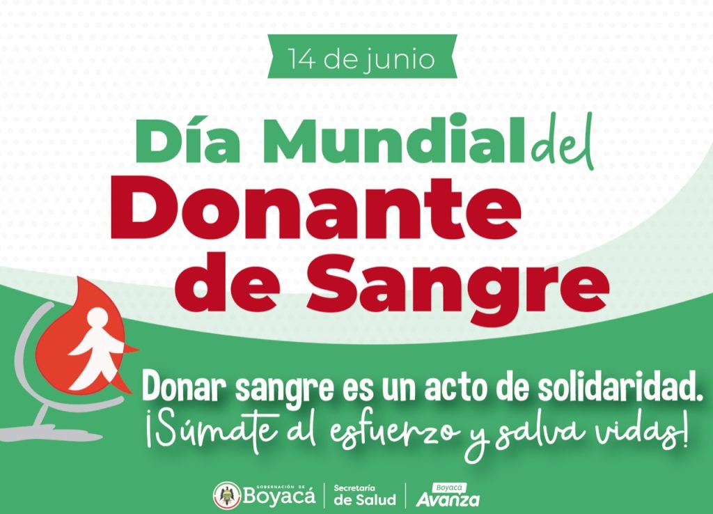 Bajo el lema ‘Donar sangre es un acto de solidaridad. Súmate al esfuerzo y salva vidas’, la Secretaría de Salud de Boyacá celebrará el próximo 14 de junio, el Día Mundial del Donante de Sangre, fecha establecida por la Organización Mundial de la Salud, OMS, y la Organización Panamericana de la Salud, OPS, en la que se quiere generar conciencia, destacar la contribución de los donantes y fortalecer la solidaridad en las comunidades.