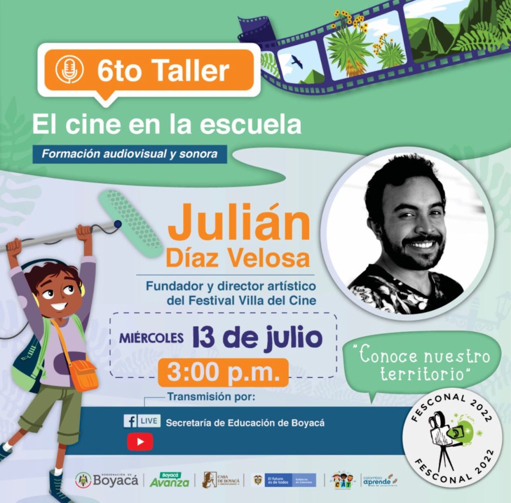 Con la participación de Julián Díaz Velosa, director del Festival Villa del Cine, se realizará el taller “El Cine en la Escuela”, este miércoles 13 de julio, a partir de las 3:00 p.m. y que será transmitido por la página en Facebook de la Secretaría de Educación de Boyacá y por el canal YouTube de la sectorial.
