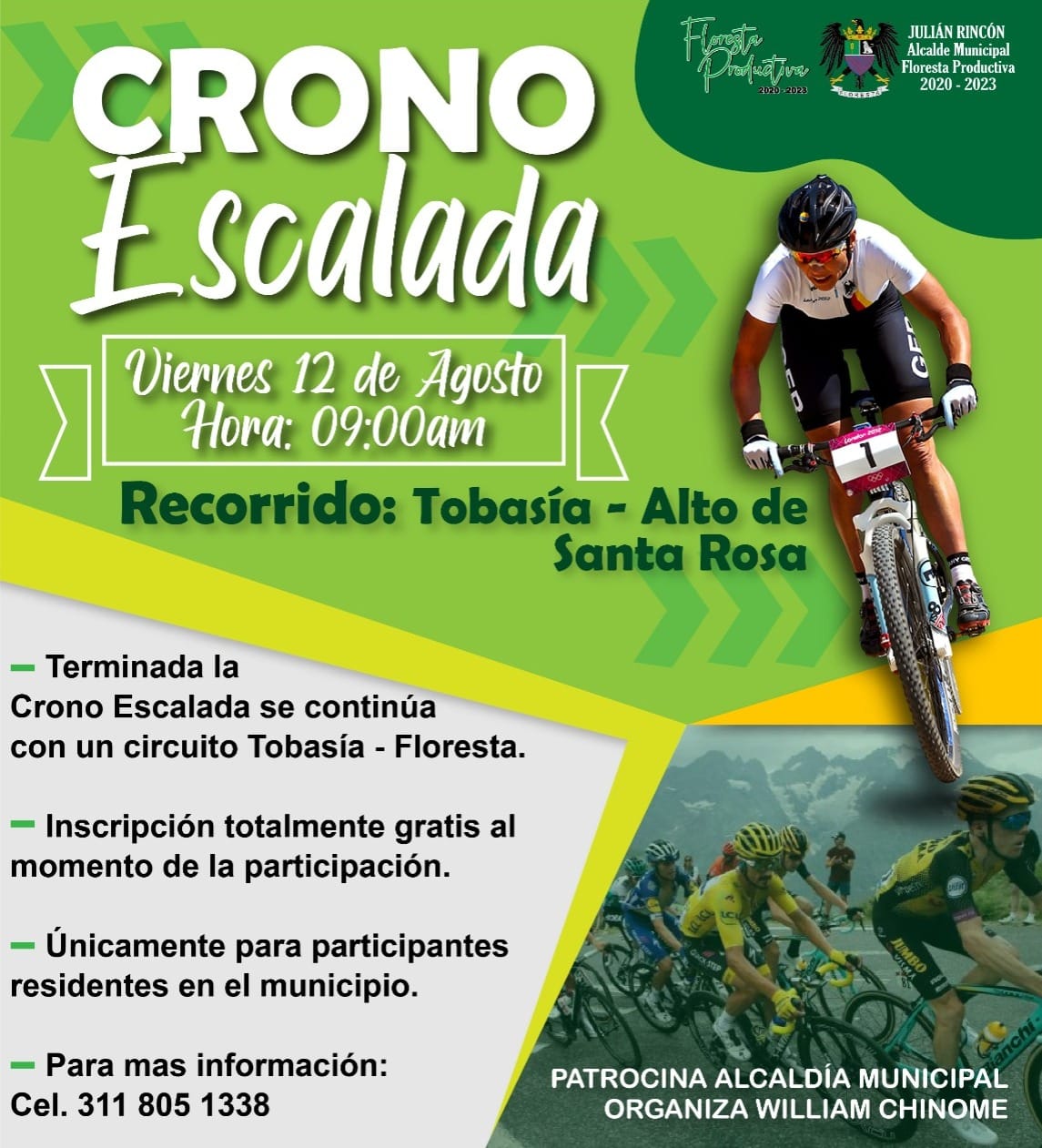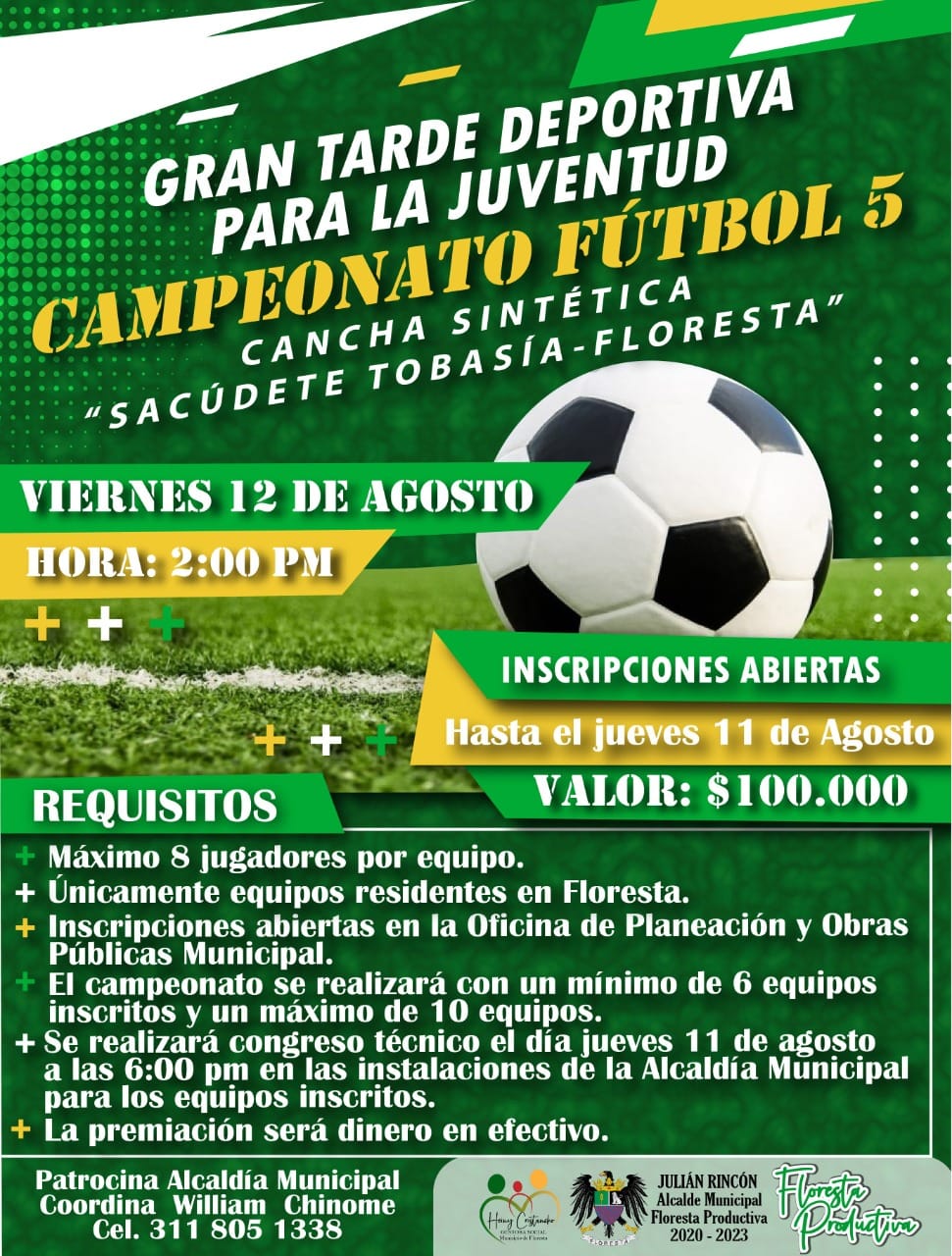 Por otro lado, Floresta vivirá eventos como la esperada Cabalgata, el Mercado Comercial y eventos deportivos como la Crono Escalada que se vivirá el próximo viernes 12 de Agosto a partir de las 9 de la mañana, con recorrido: Tobasía - Alto se Santa Rosa y terminada la Crono Escalada se continúa con un circuito Tobasía - Floresta; y el Campeonato de Fútbol 5 que se llevará a cabo el próximo viernes 12 de agosto a partir de las 2:00pm, en la cancha sintética Tobasía, Floresta.