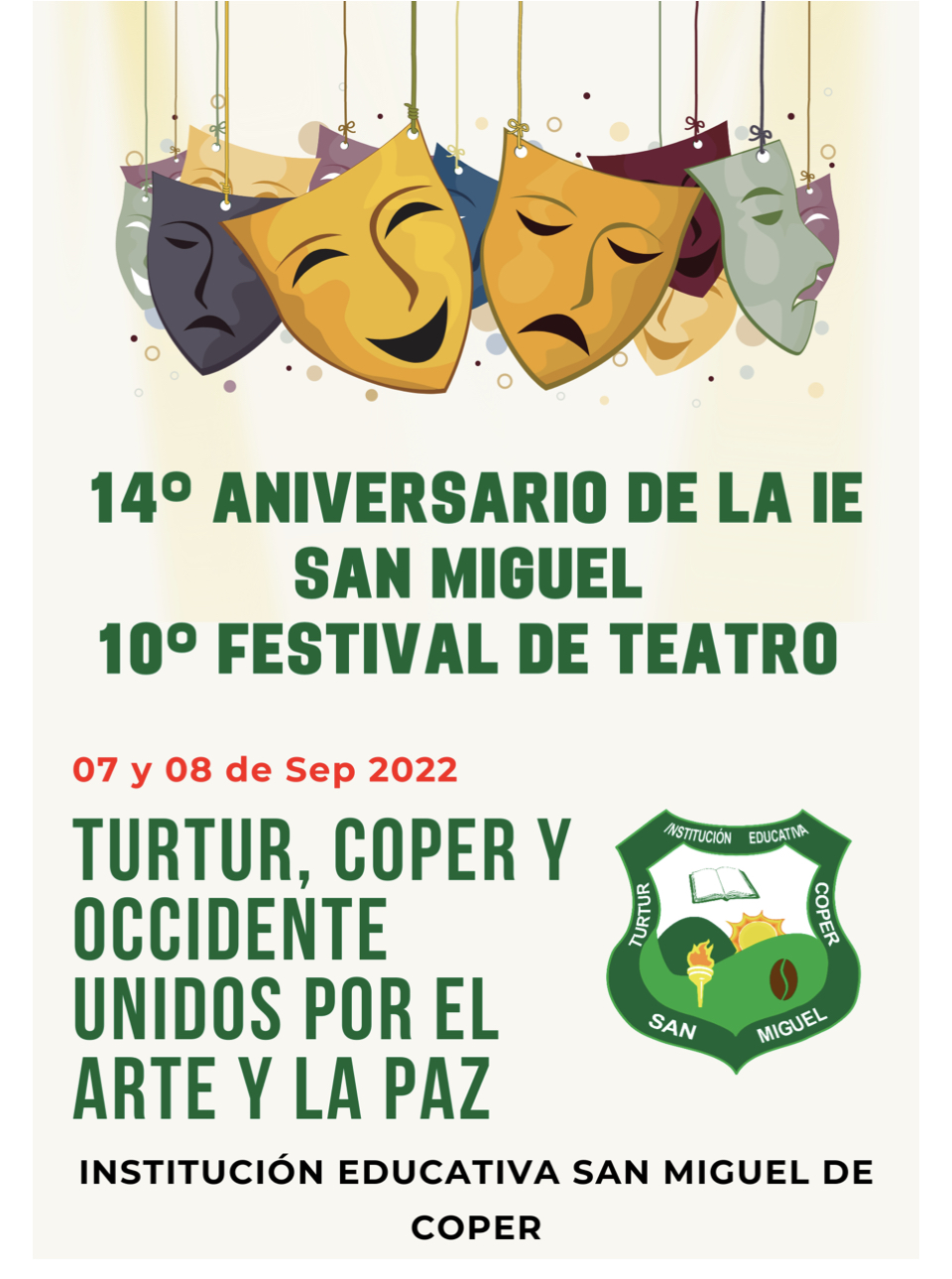 La Institución Educativa San Miguel, ubicada en la vereda Turtur del municipio de Coper, los días 7 y 8 de septiembre próximos, celebrará el Décimo Festival de Teatro ‘Turtur, Coper y Occidente unidos por el arte y la paz’.