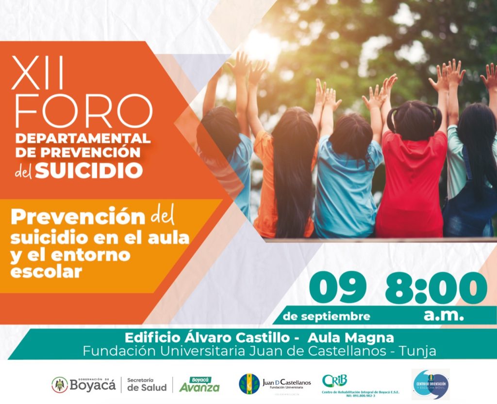 En conmemoración del Día Mundial de la Prevención del Suicidio, la Secretaría de Salud, con el apoyo de la Fundación Universitaria Juan de Castellanos, el Centro de Rehabilitación Integral de Boyacá, CRIB, y la Secretaría de Educación, llevará a cabo el ´XII Foro Departamental de Prevención del Suicidio´, enfocado a la prevención del suicidio en el aula y el entorno escolar, el próximo viernes 9 de septiembre, a las 8:00 a.m., en el Edificio Álvaro Castillo, Aula Magna de la Universidad.