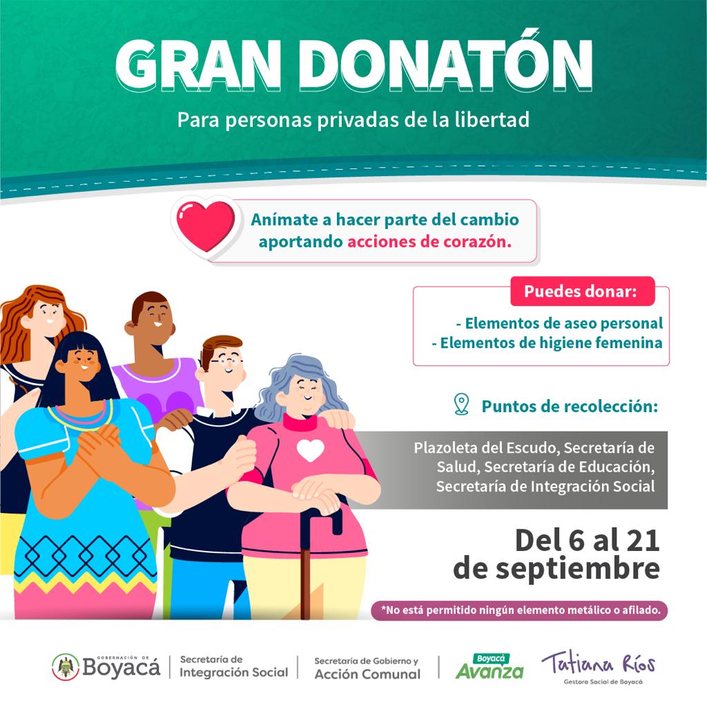 La Gobernación de Boyacá, por medio del componente de la Gestión Social que abandera Tatiana Ríos, convoca a la solidaridad de los funcionarios, funcionarias y diferentes trabajadores de la administración departamental para que se sumen a la Gran Donatón para las Personas Privadas de la Libertad.