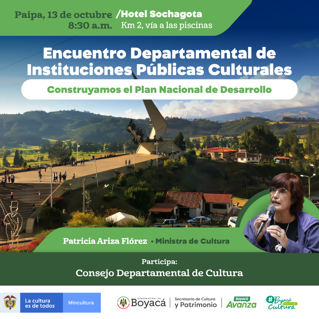 La Secretaría de Cultura y Patrimonio, liderada por Sandra Mireya Becerra Quiroz, reitera la invitación hecha a los equipos a cargo de la gestión cultural de los 123 municipios para este jueves 13 de octubre, en Paipa.