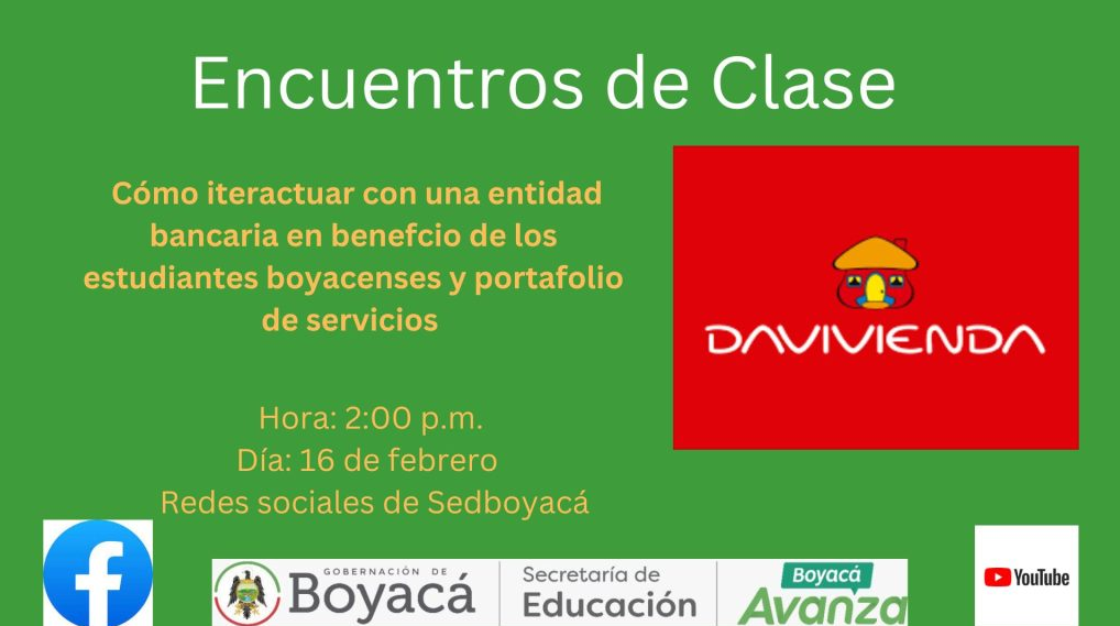 La secretaria de Educación de Boyacá, Elided Ofelia Niño Paipa, invita a la comunidad educativa y al público en general a la sesión denominada: “Cómo interactuar con una entidad bancaria en beneficio de los estudiantes y portafolio de servicios”, que ofrecerá Banco Davivienda, este jueves 16 de febrero, a partir de las 2:00 de la tarde.