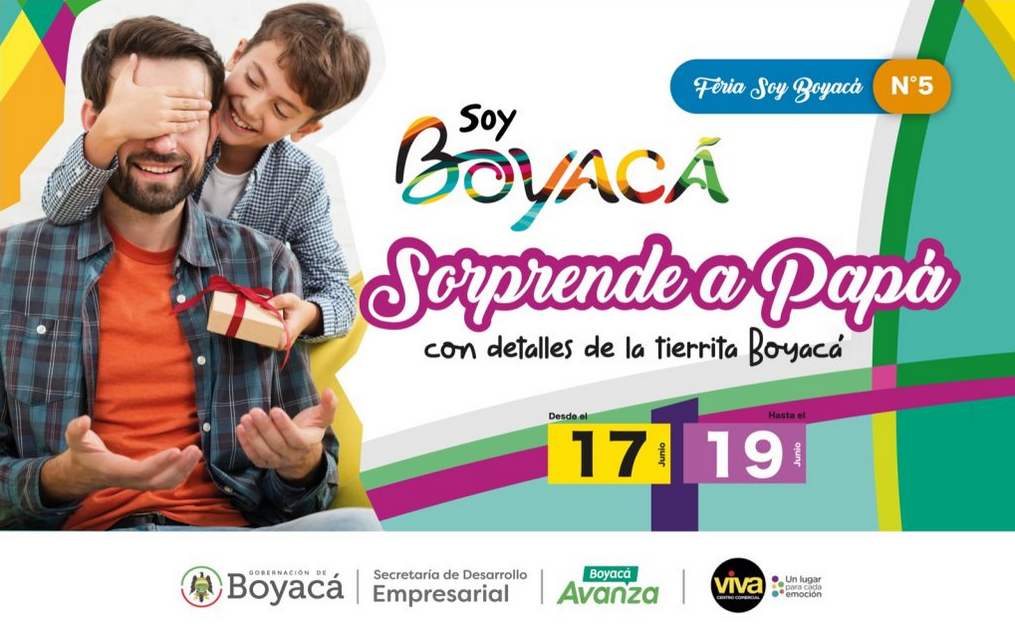 Durante el festivo del 17 al 19 de junio, la Secretaría de Desarrollo Empresarial de Boyacá y el Centro Comercial Viva invitan a la ‘Feria Sorprende a Papá con Detalles de la Tierrita’, un evento que promociona distintos productos que ofrecen los municipios del Departamento, por medio de la marca Soy Boyacá.