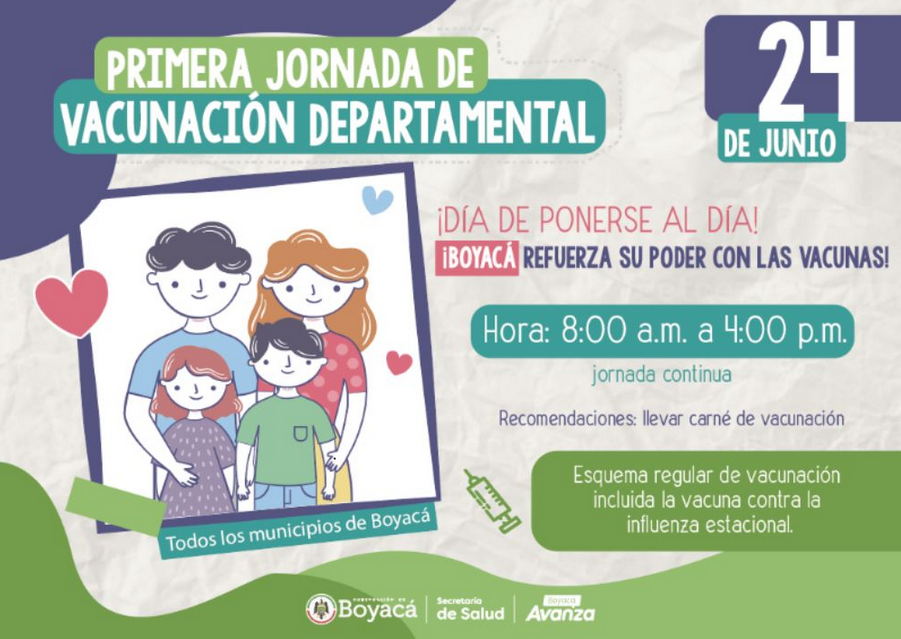 Con el propósito de dar cumplimiento a las metas nacionales en materia de vacunación y fortalecer acciones para iniciar, continuar y completar esquemas de vacunación en Boyacá, la Secretaría de Salud Departamental invita a la comunidad a participar en la Primera Jornada Departamental de Vacunación, ‘Boyacá refuerza su poder con las Vacunas’, este sábado 24 de junio, de 8:00 a.m. a 4:00 p.m.