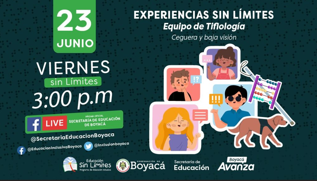 La Secretaría de Educación de Boyacá invita a la comunidad en general a participar en una nueva sesión de “Viernes sin Límite”, este 22 de junio, a partir de las 3:00 p.m., en la que se compartirán algunas experiencias de ceguera y baja visión que ha tenido el equipo de Educación Inclusiva que presta sus servicios en varias instituciones educativas del territorio boyacense.