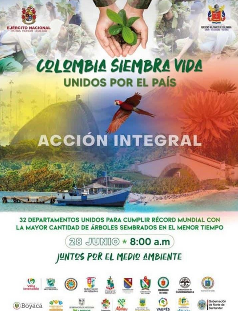 Este miércoles 28 de junio a partir de las 8:00 de la mañana, comenzará en todo el país la gran sembratón nacional, “Colombia Siembra Vida Unidos por el País”, jornada organizada por el Ejército Nacional a la cual se vincularán los 32 departamentos para cumplir el récord mundial con la mayor cantidad de árboles sembrados en el menor tiempo posible.