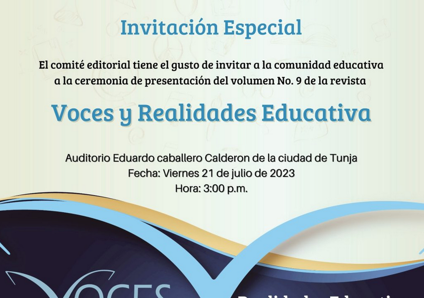 Con el propósito de explorar la importancia de escribir como un medio para transformar la educación, examinando su relevancia en el contexto escolar y universitario, los creadores de la revista de Docencia e Investigación “Voces y Realidades Educativas” reiteran la invitación al acto de lanzamiento de la novena edición, evento que se llevará a cabo este 21 de julio, a partir de las 3:00 p.m. en el auditorio Eduardo Caballero Calderón de la Secretaría de Cultura y Patrimonio de la ciudad de Tunja.