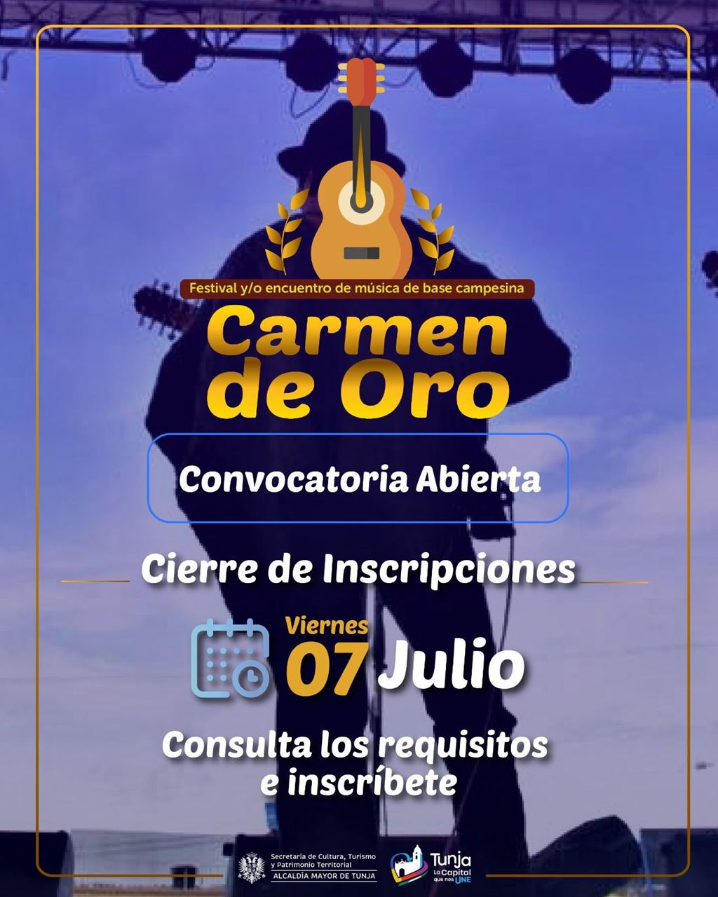 Se abre la convocatoria para participar en el tradicional Festival de Música de Base Campesina el “Carmen de oro”. El propósito de este festival es preservar, valorar y difundir la música de base campesina, a través de sus máximos exponentes.