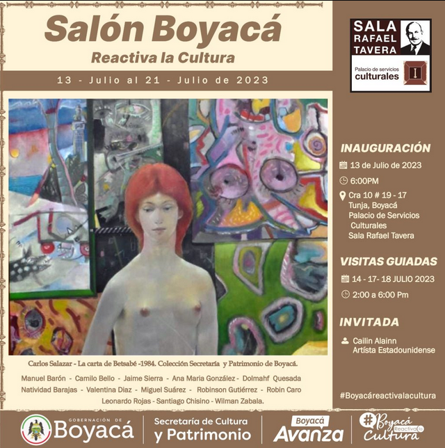 Así mismo contará con la participación de Cailin Ailinn de Estados Unidos; también estará una obra que hace parte de la colección permanente de la dependencia del Gobierno de Boyacá, titulada ‘La Carta de Betsabé’, del artista Carlos Salazar, obra premiada en 1984 con el Primer Puesto del Salón Nacional de Artistas.