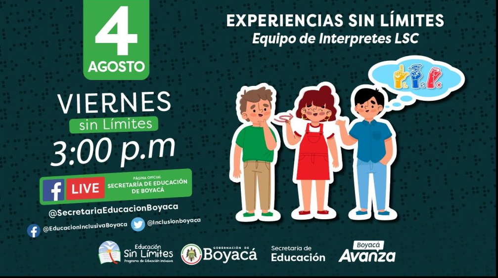 El gobernador de Boyacá, Ramiro Barragán Adame; y la secretaria de Educación de Boyacá, Elided Ofelia Niño Paipa, invitan a la comunidad, en general y a la educativa, en particular, a participar en el espacio “Viernes sin Límites”, este 4 de agosto de 2023, a partir de las 3:00 p.m., por las redes sociales de la sectorial, en el que se tratarán temas relacionados con experiencias significativas con grupo de intérpretes de Lengua de Señas Colombiana
