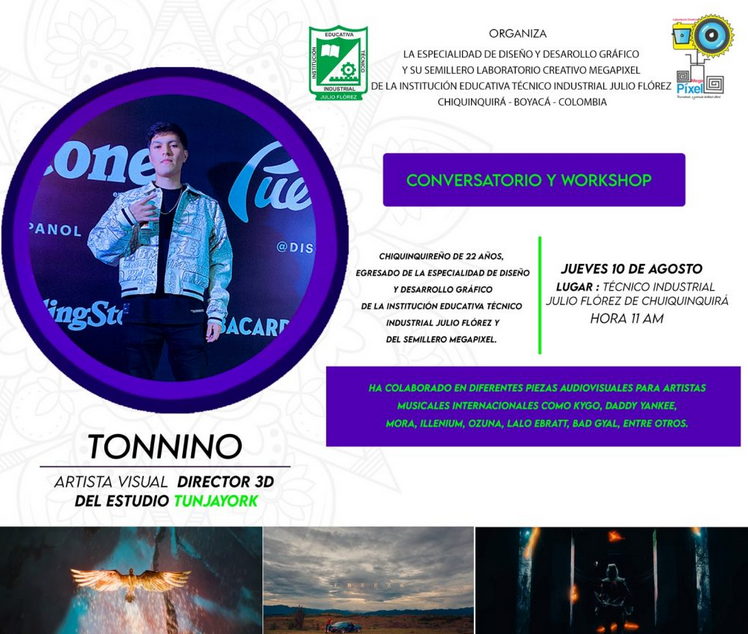 Cristian Sebastián Camacho, más conocido en el mundo del entretenimiento y las industrias creativas como: «TONNINO», artista visual Chiquinquireño, presentará su experiencia como director 3D del estudio creativo Tunjayork Esperamos a todos los en el aula múltiple de la Institución Educativa Técnico Industrial “Julio Flórez”, este 10 de agosto, a partir de las 11:00 a. m.