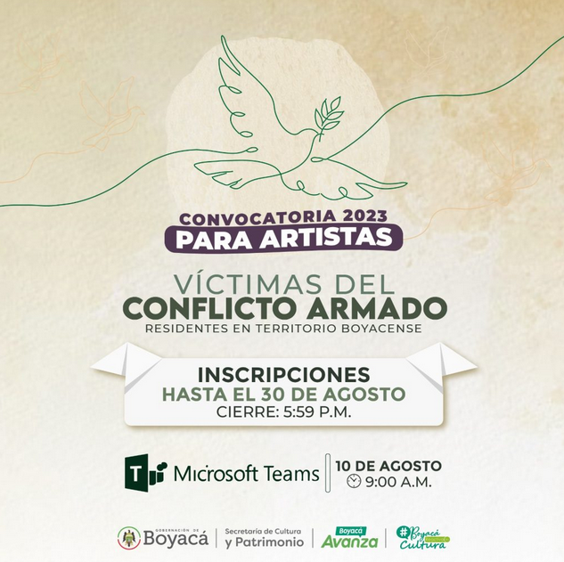 El gobierno Boyacá Avanza ha demostrado su accionar hacia el sector cultural y patrimonial basado en la participación, inclusión y la igualdad. Por ello se ha logrado que este sector se destaque en el departamento y en tierras nacionales, dentro de otras razones se encuentra también la convocatoria que el año anterior fue puesta a disposición de artistas que hacen parte de la población Víctima del Conflicto Armado, luego de esto, y siendo este proceso una acción que benefició a este tipo de población, la Secretaría de Cultura y Patrimonio de Boyacá abre para este 2023 la Convocatoria dirigida a artistas Víctimas del Conflicto.