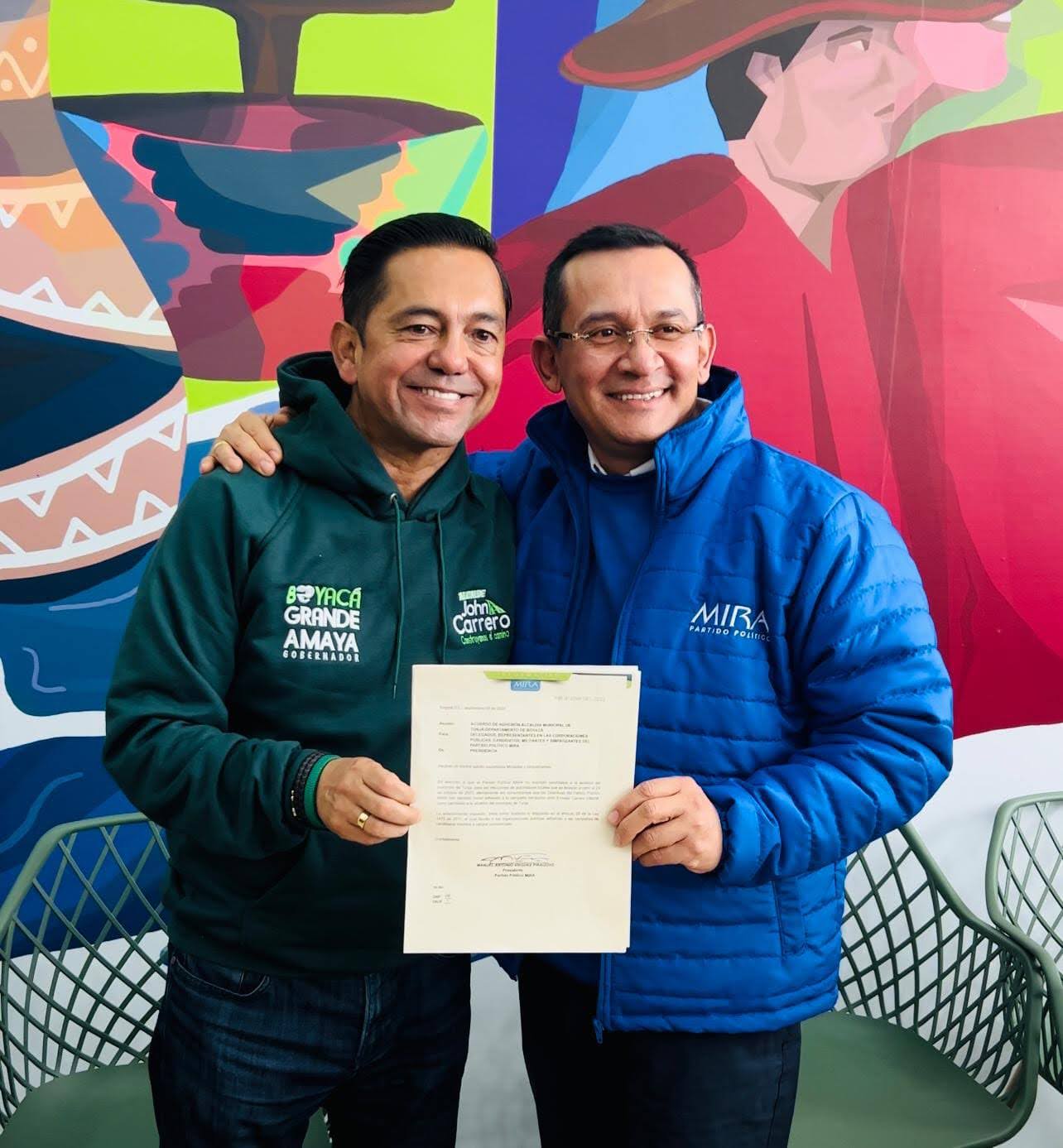 Este miércoles en Tunja, Carlos Amaya y John Carrero recibieron un nuevo apoyo para sus candidaturas: el partido MIRA anunció que acompañará a los dos políticos de la Alianza Verde en su camino a la Gobernación de Boyacá y Alcaldía de Tunja. De acuerdo con Vladimir Rodríguez, vocero de la colectividad cristiana, esta alianza se da en pro de la ciudad y el departamento.
