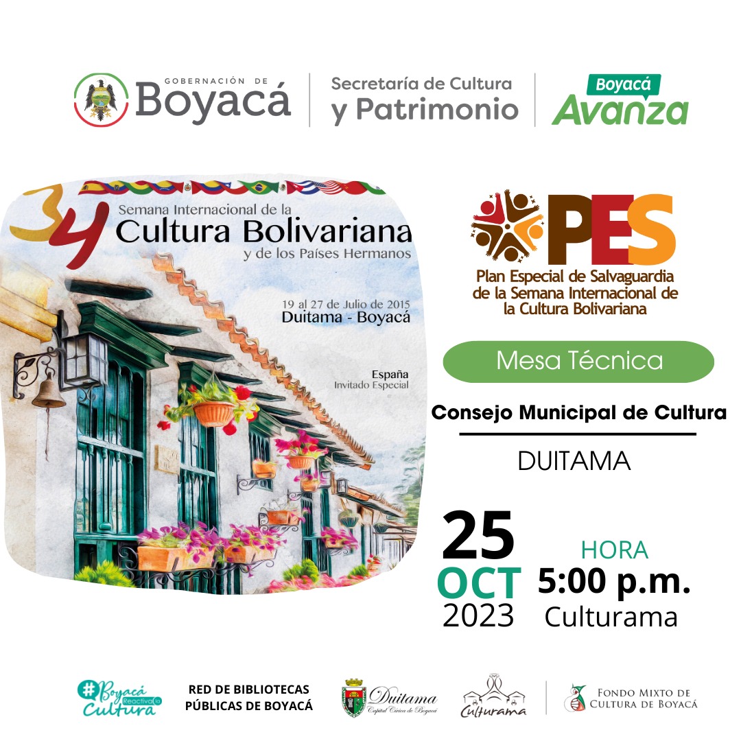 La Mesa Técnica con el Consejo Municipal de Cultura, que se llevará a cabo el miércoles 25 de octubre, en la ciudad de Duitama Sede (Culturama) a partir de las 5 p.m. es una oportunidad única para participar en la construcción del diagnóstico participativo del Plan Especial de Salvaguardia de la Semana Internacional de la Cultura Bolivariana.