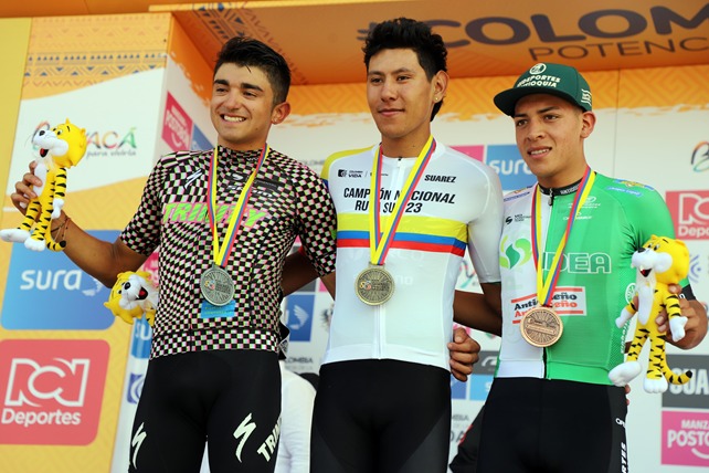 El podio de los Nacionales Sub 23: Brandon Rojas medalla de oro, Camilo Gómez plata y Paulo Pantoja bronce.