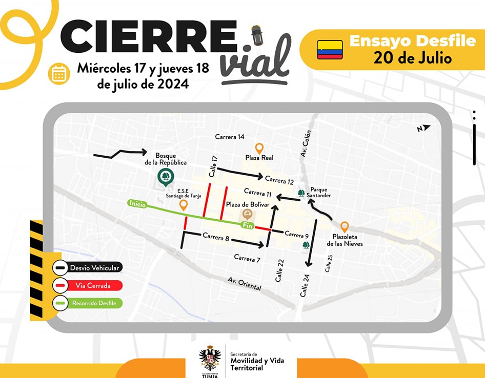 Todos los años, Tunja conmemora el 20 de julio (Día de la Independencia) con un desfile militar, el cual avanza por las calles de la ciudad. Este año no es la excepción, por lo que la alcaldía de la capital boyacense ordenó un cierre vial para que se puedan hacer los ensayos pertinentes que den éxito a este evento.